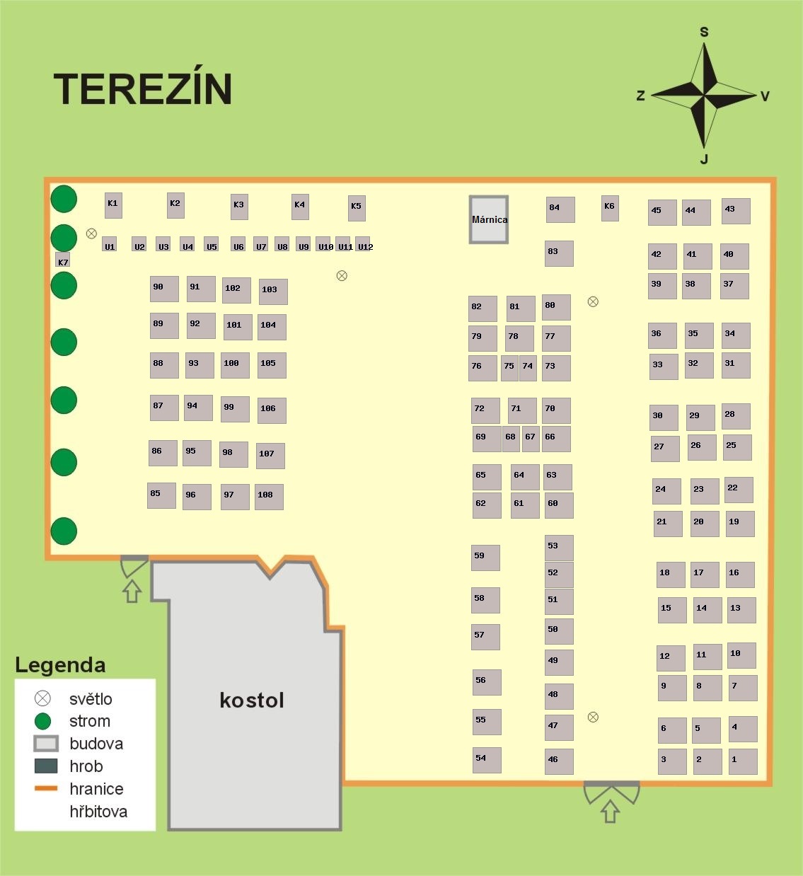 Občané Terezína si své zesnulé pohřbívali na hřbitově v Hovoranech, kam také docházeli i do kostela. Dříve, než byl v Terezíně kostel, postavili si občané svůj vlastní hřbitov a 5. července 1899 byl vysvěcen. Rozšířit se musel v roce 1976 o „nový hřbitov“ ve vyšší poloze, v součinnosti se starým hřbitovem. V roce 1996 byla dokončena oprava a rekonstrukce obou hřbitovů, které byly osvětleny zároveň s kostelem. V katastru obce a na hřbitově je také pět křížů, které byly zbudovány našimi předky a jsou památkami obce.